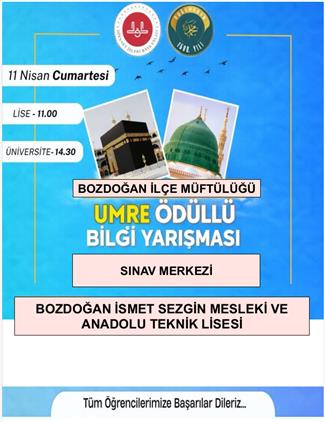 11 Nisan 2026 Cumartesi günü saat 11.00'de lise öğrencilerine yönelik, saat 14.30'da da üniversite öğrencilerine yönelik ülke genelinde düzenlenecek olan Umre Ödüllü Gençlik Bilgi Yarışması İlçemizde Bozdoğan İsmet Sezgin Mesleki ve Anadolu Teknik Lisesinde düzenlenecek.