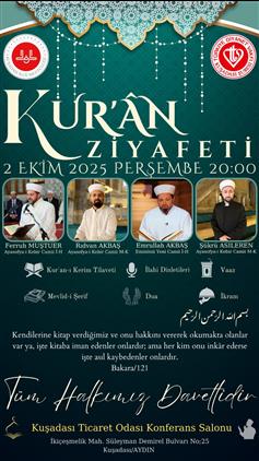 "1-7 Ekim Camiler ve Din Görevlileri Haftası Etkinlikleri" kapsamında İlçe Müftülüğümüzce 02.10.2025 tarihinde 20:00-22:00 saatleri arasında Kuşadası Ticaret Odası (KUTO) konferans salonunda Ayasofya-i Kebir Cami-i Şerifi Başimam-Hatibi Ferruh MUŞTUER, Müezzin-Kayyımları Rıdvan AKBAŞ, Şükrü ASILEREN ve Eminönü Yeni Cami İmam-Hatibi Emrullah AKBAŞ hocalarımızın katılımlarıyla "Kur'an Ziyafeti Programı" icra edilecek ve akabinde vatandaşlarımıza ikramda bulunulacaktır.