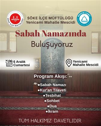 Söke İlçe Müftülüğümüzün koordinesinde 6 ARALIK 2025 Cumartesi günü Yenicami Mahalle Mescidi' ndeki SABAH NAMAZI BULUŞMASINA tüm halkımız davetlidir.